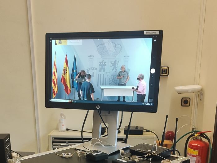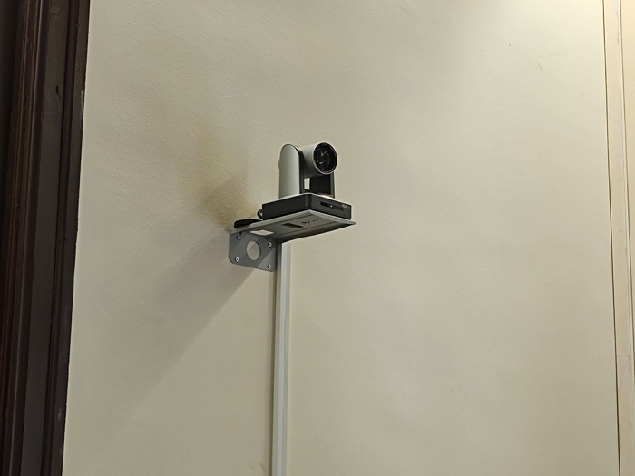 Se instaló una cámara PTZ en la pared opuesta al atril, conectada por HDMI a un ordenador de alto rendimiento capaz de procesar y transmitir tanto el sonido como las imágenes de la cámara a través de Internet. El sistema ha sido configurado para poder transmitir a través de cualquier plataforma conocida.