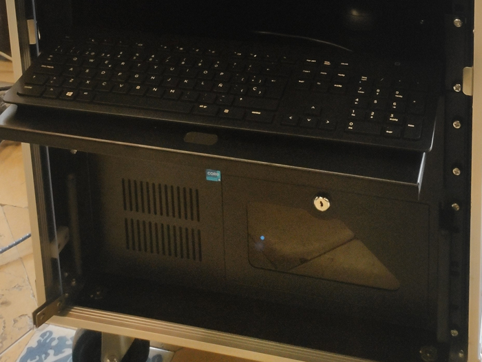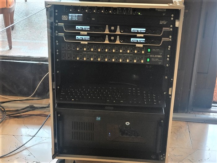 Este ordenador dedicado exclusivamente a esta sala se montó dentro de una carcasa enracable. Sus características técnicas son las siguientes: es un i5 con 16 Gb de RAM, un disco duro SSD de un 1Tb y una tarjeta gráfica GTX1650. El sistema operativo es el Windows 10 Pro, con posibilidades de pasar a Windows 11. Además se instaló una capturadora de video 4k pro para, a parte de reproducir en streaming, poder hacer grabaciones de calidad.