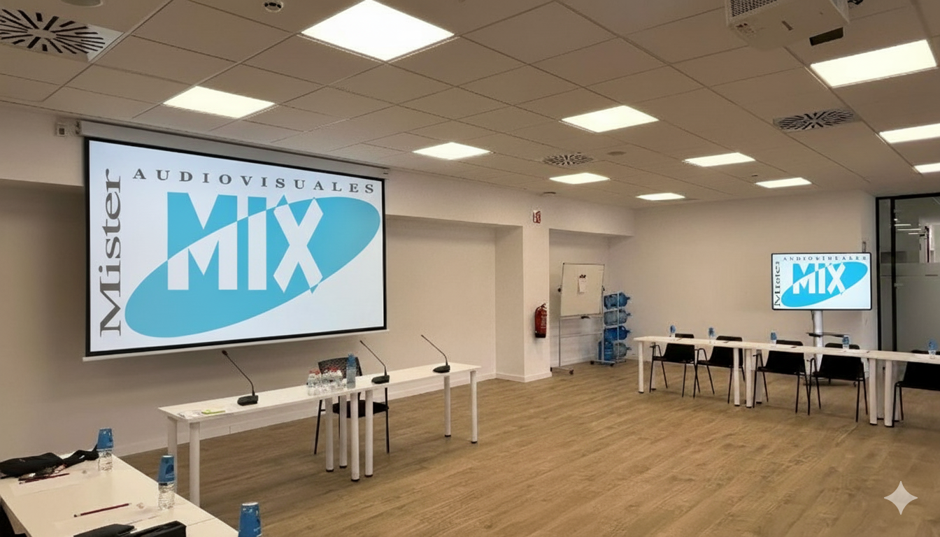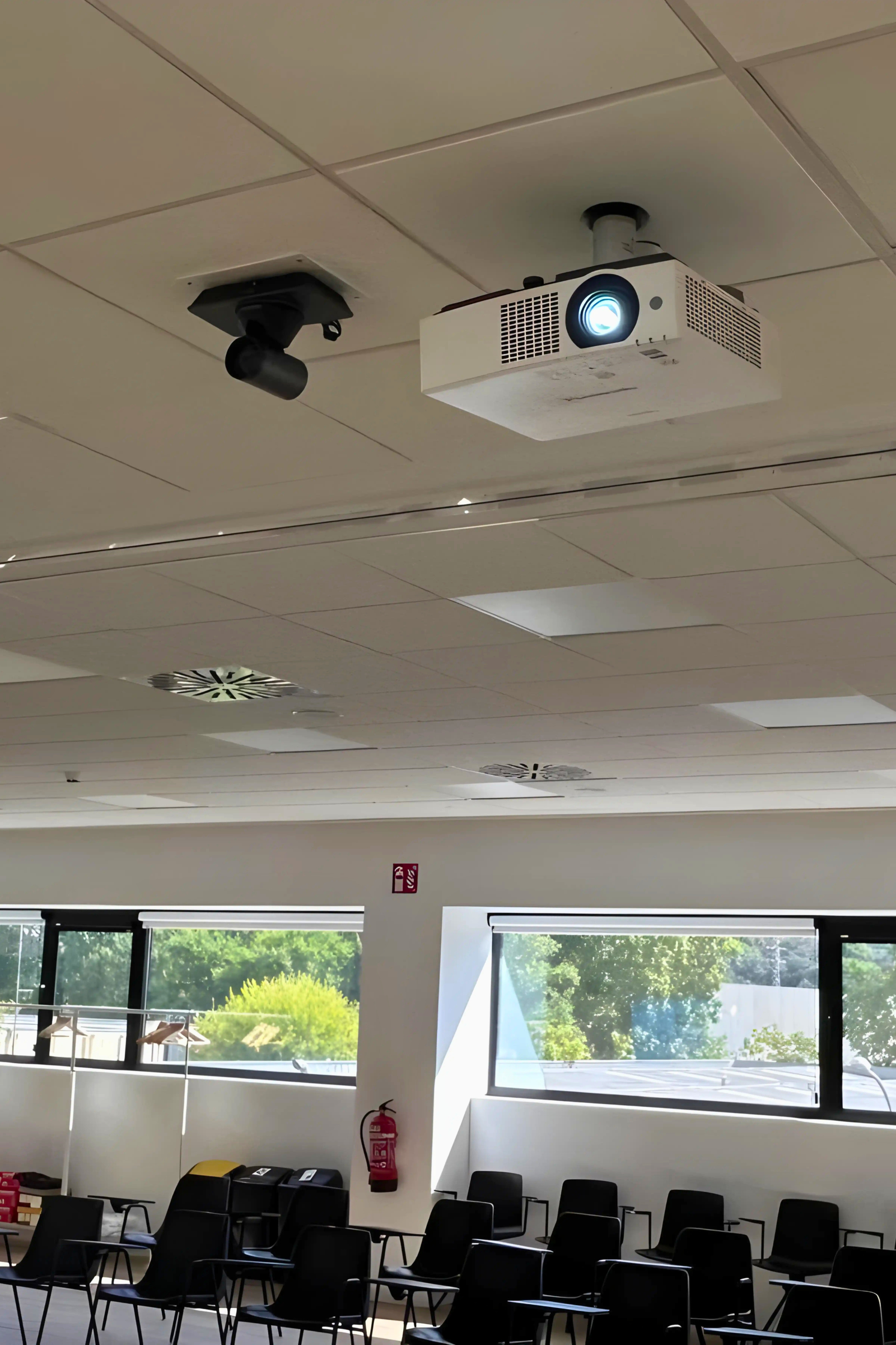 En resumen, esta solución combina proyección láser, pantallas auxiliares y cámara PTZ para lograr un auditorio versátil y preparado para cualquier escenario. Las pantallas móviles, además de reforzar la visibilidad, pueden utilizarse en la sala secundaria cuando el espacio se divide, optimizando recursos.