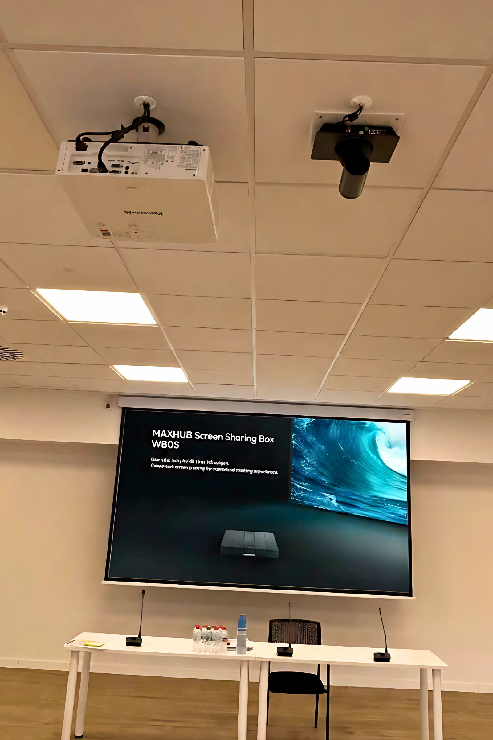 Aquí está la diferencia. La solución de Maxhub, en este caso gracias al Maxhub Box WB05, un Sistema de Gestión de Dispositivos y Control de Salas, que puede habilitar equipos externos, en este caso conectando el dongle de Maxhub WT13M para ser el “cerebro” del auditorio y tomar el control del proyector, la cámara PTZ y los micrófonos para streaming tanto para la emisión en directo como para la plataforma escogida para la videoconferencia.