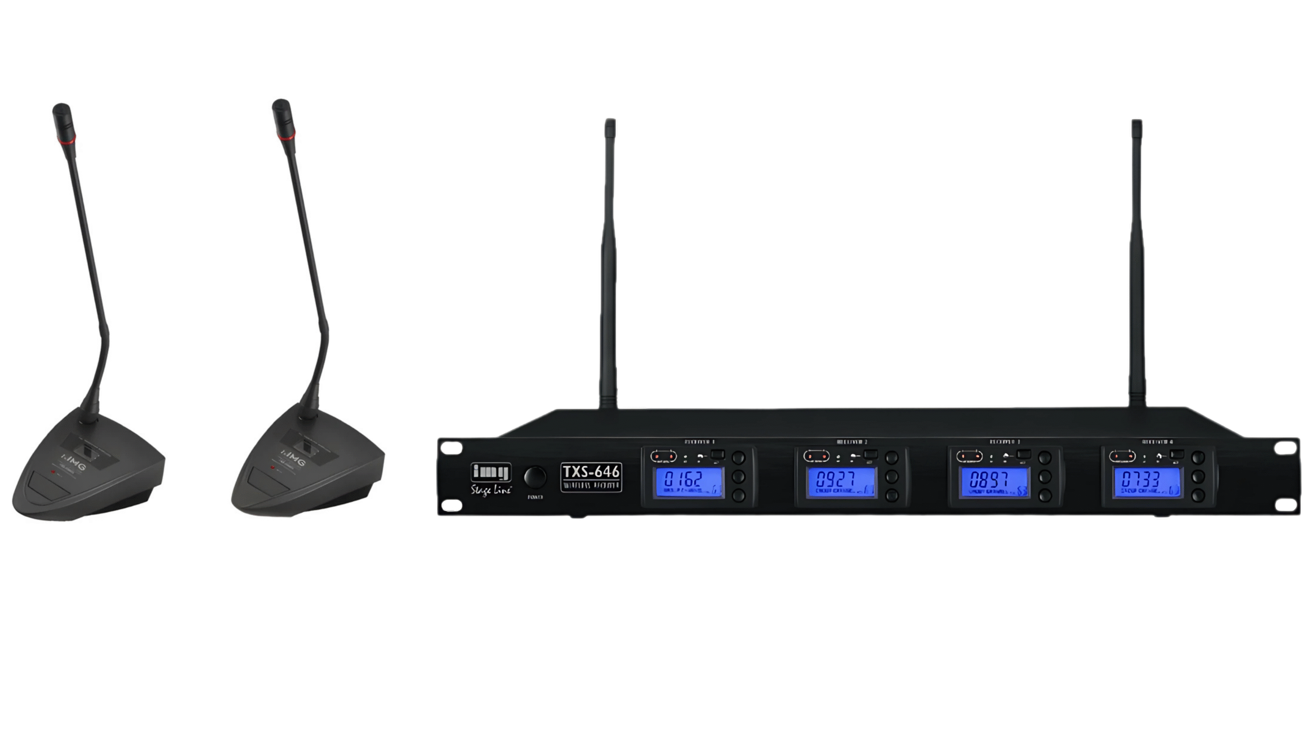 La microfonía inalámbrica para la sala se resolvió con un receptor de 4 canales multifrecuencia STAGELINE TXS-646 junto con varios micrófonos de sobremesa inalámbricos STAGELINE TXS-606DTS y algún micrófono de mano inalámbrico IMG STAGELINE TXS-606DHT.