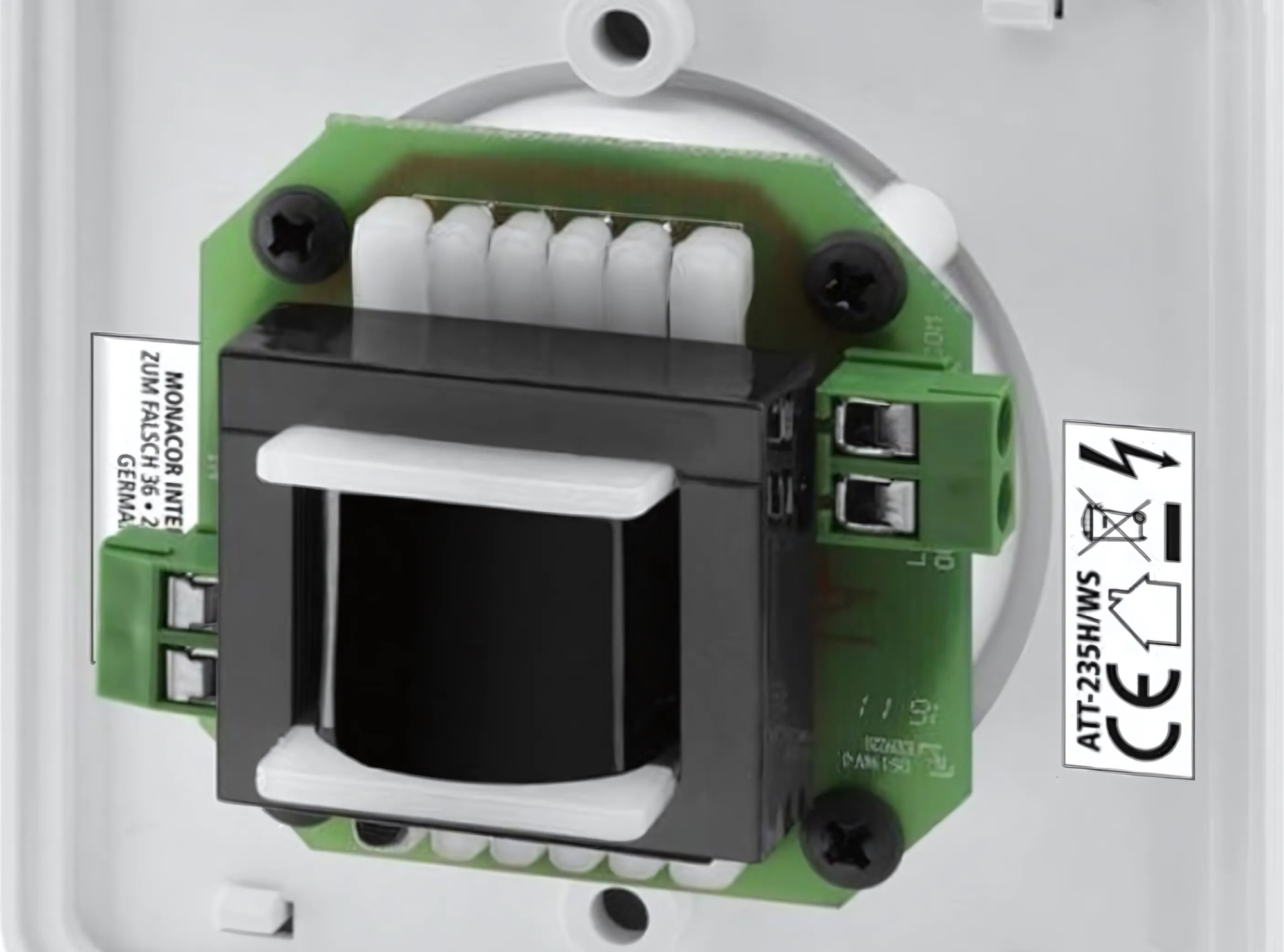 Con la finalidad de poder regular de forma independiente los volúmenes de las dos zonas, pero poder utilizar el amplificador de una zona anteriormente comentado, se instalaron dos atenuadores de volumen Monacor ATT 235. Estos los hemos situado en el mismo armario donde se encuentra el amplificador.
