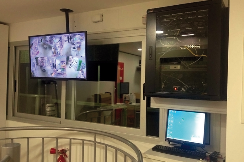 Para la supervisión del sistema de control del turno de atención al cliente se instalaron 4 televisiones de 28” marca Sunstech de color blanco totalmente integradas con la decoración de los espacios. También se instaló una televisión de 42 pulgadas para el control de todas las cámaras de seguridad. Esta permite el modo multipantalla para visualizar todas las cámaras de seguridad simultáneamente y seleccionar las que se quiera ver ampliadas en cualquier momento.