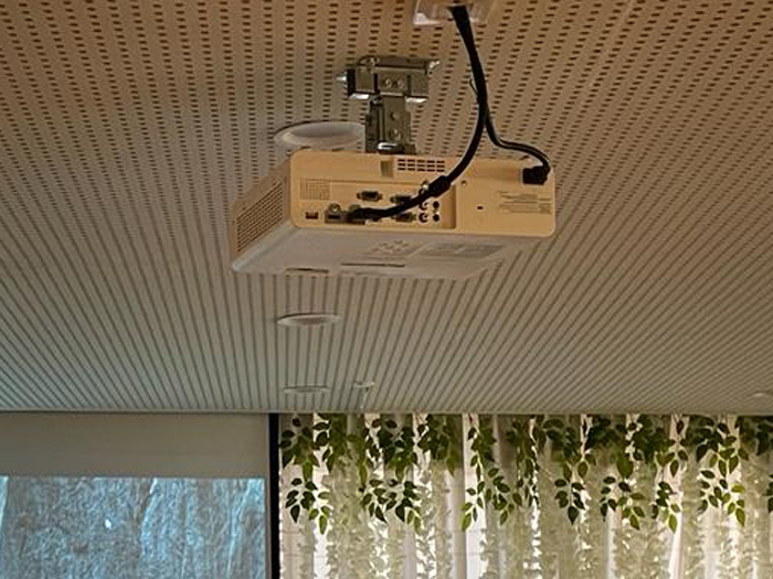 El proyector se sustituyó por un proyector Panasonic de 3600 ANSI PT-LW376E. Se tuvo que pasar un cable HDMI de 15 metros utilizando la vía del antiguo cable VGA, desde el ordenador de la mesa de control hasta el proyector. Para el nuevo proyector, se instaló un nuevo soporte de techo para proyector. Por otra parte, la pantalla de proyección se pudo aprovechar.