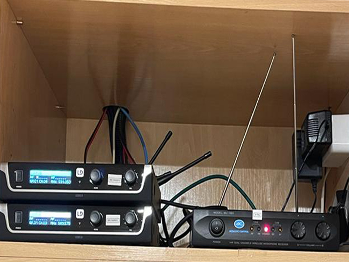 Como hemos comentado anteriormente, se pudieron aprovechar los altavoces instalados. Sin embargo, se sustituyeron los micrófonos por unos LD U505HHD para evitar acoples y otras interferencias molestas. Uno de los micrófonos estaría destinado al ponente y el otro lo utilizaría la gente del público para realizar aportaciones o preguntas.