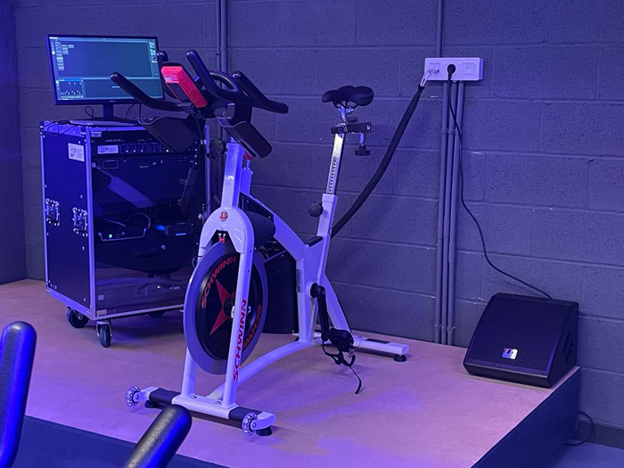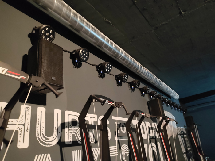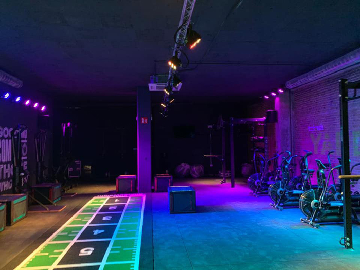 La segunda sala, llamada The Yard, es un estudio boutique de entrenamiento HIIT en grupo con tecnología de monitorización para ejercitarte de la mejor manera, es la sala más especializada de todas. Con dos particularaidades, la primera no hay escenario. Y la segunda, el sonido no se puede enfocar desde una sola dirección. Este se tiene que recibir desde varios puntos a la vez. Para conseguir la mejor calidad de sonido hemos creado seis puntos de sonido.
