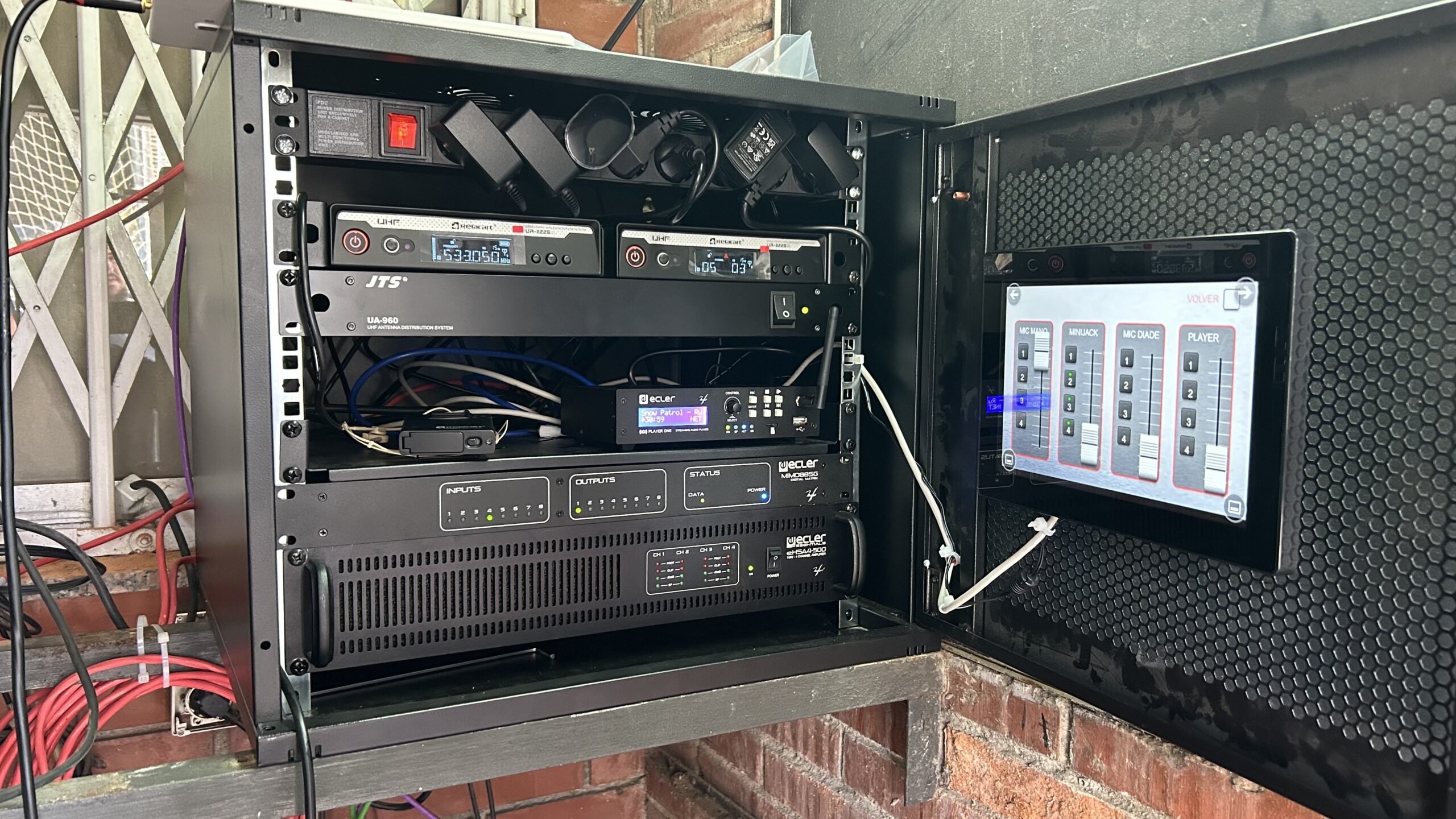 Para reforzar aún más la cobertura, añadimos dos antenas direccionales JTS UDA-49A y un distribuidor de antenas JTS UA-960, que optimizan la recepción de la señal inalámbrica en todo el recinto. Gracias a esta configuración técnica, el personal del centro puede utilizar los micrófonos desde cualquier ubicación, disfrutando de una transmisión de audio robusta, continua y totalmente fiable, incluso en exteriores y en largas distancias.