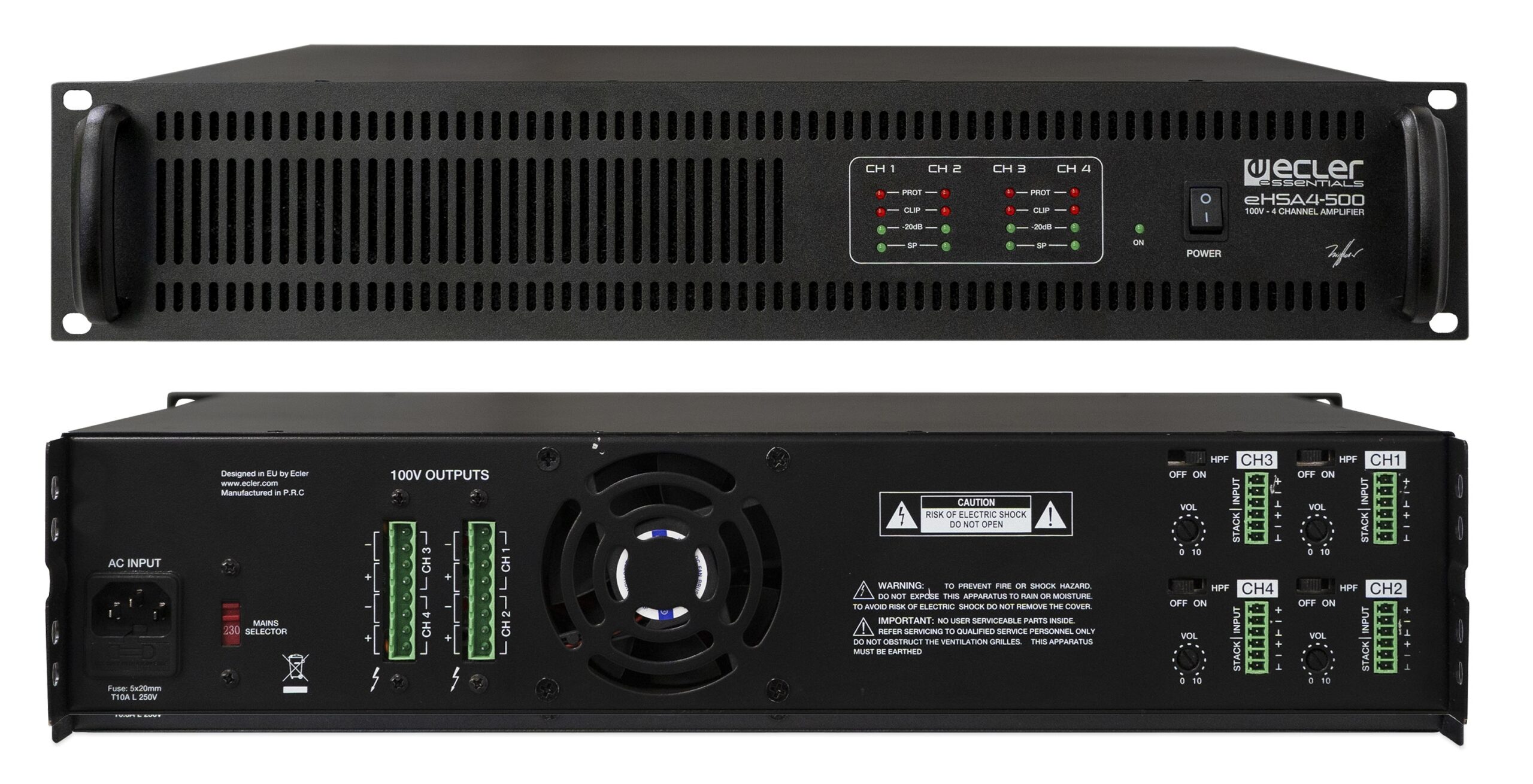 La amplificación se resolvió mediante una etapa Ecler EHSA4500, capaz de suministrar 4×500 W a 100 V, ideal para instalaciones de gran extensión. Esta configuración garantiza que cada zona del recinto reciba la potencia necesaria de forma eficiente, manteniendo la calidad del audio incluso en largas distancias y en condiciones de uso continuado.