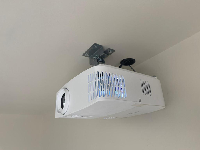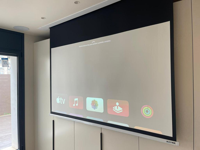 La pantalla de home cinema empotrable escogida fue la Kimex 048-1511W inteligente con wifi y mando a distancia, dando un tamaño de 80 pulgadas. El proyector escogido fue un Optoma UHD55 4K de 3600 ANSI con Trigger. Los altavoces de techo direccionables fueron unos Cambridge C-165 SS.