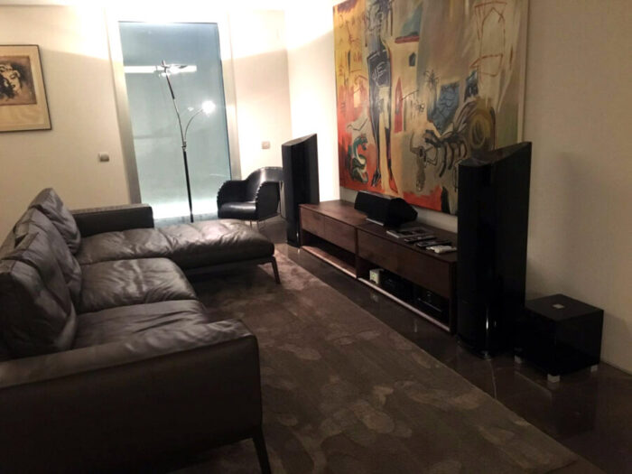 Para la configuración del Home Cinema se utilizaron Altavoces Sonus Faber Venere 2.5 como altavoces principales. Como altavoz central se utilizó el Sonus Faber Centre. Ante la imposibilidad de poner unos altavoces de suelo los dos altavoces traseros fueron altavoces de techo. Se decidió colocar los modelos Boston Acoustics HSI-460. El sistema se completó con un Subwoofer activo REL Acosutics T5i en color negro piano.