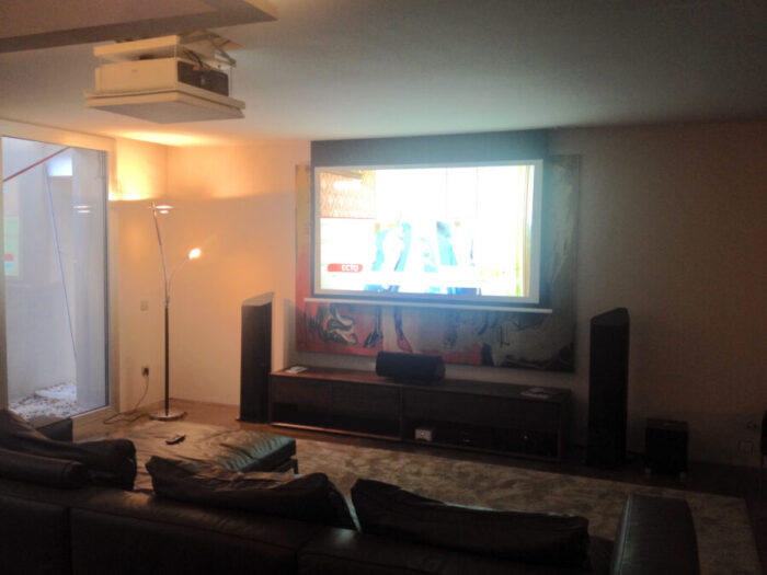 Para ello hicimos la instalación de un proyector de alta resolución Sony VPL-CH350 FULL HD de 4000 ANSI. Junto con una pantalla de alta calidad, la pantalla eléctrica Oray Square de 200×112. El equipo de sonido envolvente 5.1 no fue otro que el los sistemas y componentes del Sonus Faber de la serie Venere.