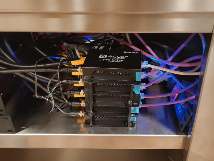 Además, dado que la distancia desde la fuente de imagen a cada una de las pantallas es muy elevada, se decidió instalar 5 extensores de HDMI. Uno para cada pantalla. Los extensores de HDMI 4K ECLER CVEOXPT24 de la serie VEO de Ecler han conseguido transmitir una calidad de imagen excelente tanto en los televisores como en el proyector.
