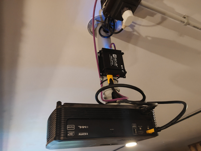 La instalación de los equipos de imagen fue compleja debido al gran número de pantallas y la distancia a la fuente de los contenidos. En este caso se decidió reproducir el mismo contenido en todas las pantallas, aunque se podría llegar a reproducir diferente contenido en cada una de ellas puesto que todas las pantallas tienen su propio cable HDMI que llegan a la zona de control. Gracias a dos splitters, uno el SPLITTER HDMI 1 IN-4 OUT ECLER VEO SPH44 y el SPLITTER HDMI 2.0 ECLER VEO SPH42 conectados entre sí se consiguió duplicar el contenido procedente de un Movistar TV Pro en 4 televisores y un proyector. Es decir, desde la misma fuente con una sola salida de contenido se consiguió replicar en 5 pantallas de forma simultanea.