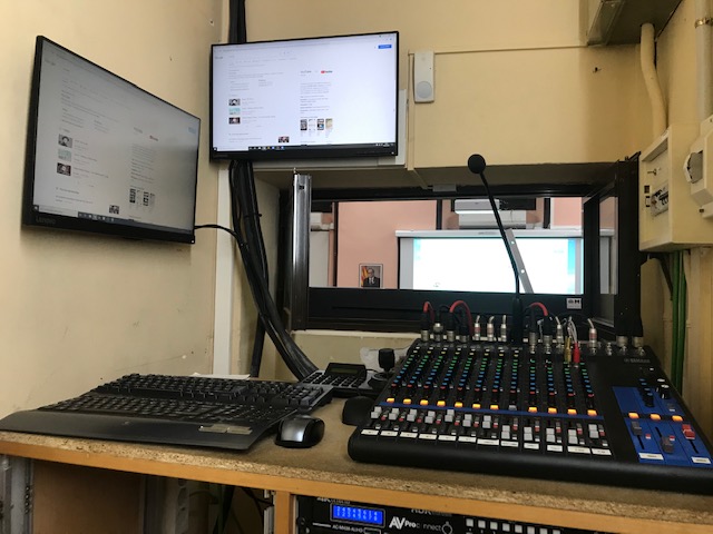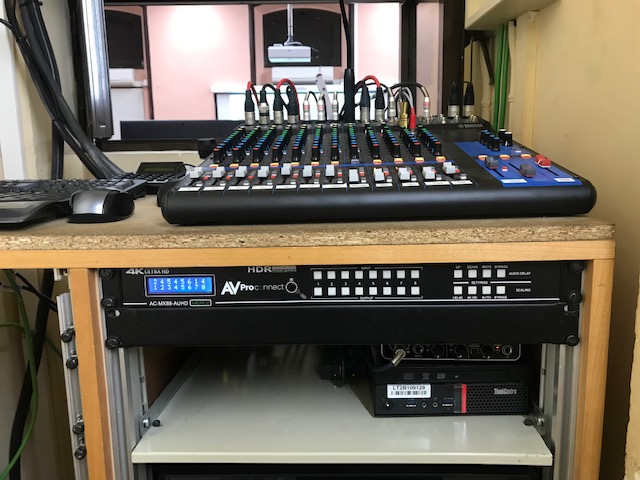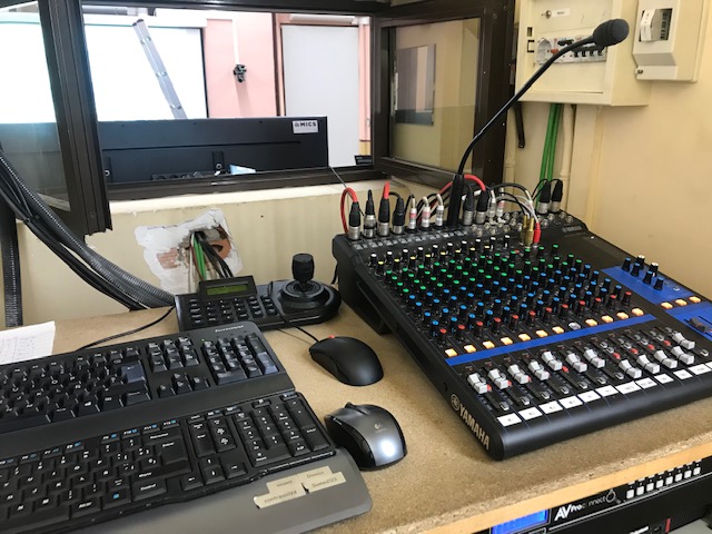 En segundo lugar, para controlar y distribuir el sonido de los micrófonos hemos instalado una mesa de directo Yamaha MG16 de 16 canales. Esta nos permite enviar el audio a través de cualquiera de las salidas preestablecidas, como podría ser la salida de la sala de prensa a través de los altavoces o directamente en streaming, por internet o por televisión.
